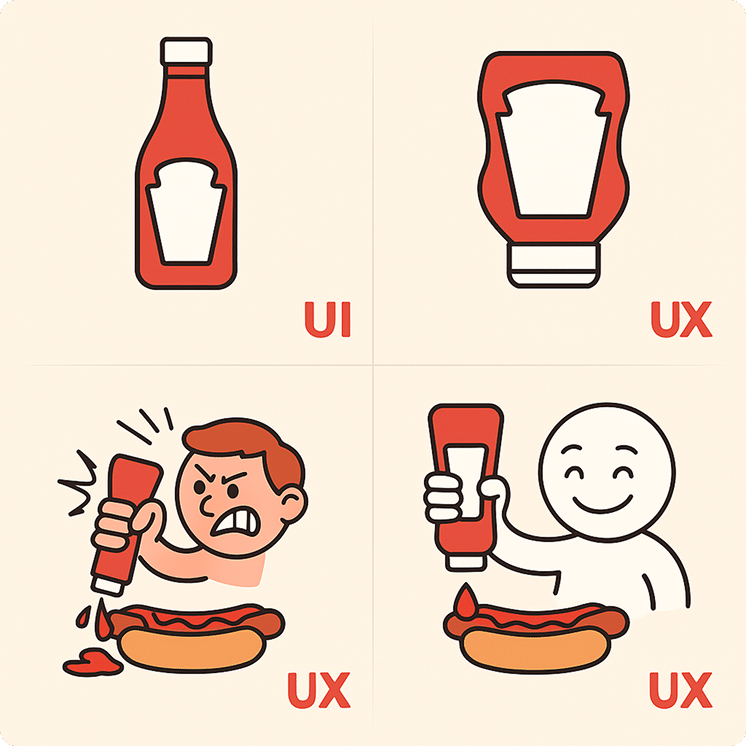 De fles ziet er goed uit, maar ondersteunt je niet in wat je wilt doen. Het ontwerp levert frustratie op in plaats van gemak. Vergelijk dat met de knijpbare spuitfles. Die is misschien minder elegant, maar werkt intuïtief: je knijpt en je krijgt precies de hoeveelheid ketchup die je nodig hebt. Geen geknoei, geen irritatie, geen verrassingen.