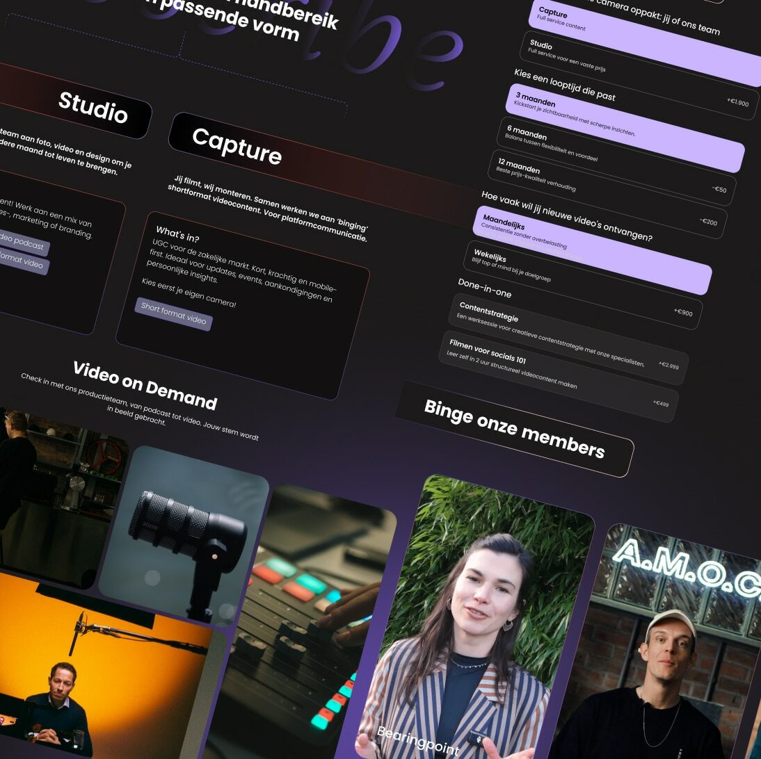 Om dit te bereiken hebben wij een website ontwikkeld waarin de beleving van videocontent direct centraal staat. Het design is strak en minimalistisch, zodat beeldmateriaal en voorbeelden alle aandacht krijgen. De structuur van de site leidt de bezoeker stap voor stap door het verhaal: van het probleem (“gebrek aan zichtbaarheid”) naar de oplossing (content op structurele basis) en de concrete pakketten die Inscapement aanbiedt. Heldere visuals en korte, krachtige teksten nemen twijfels weg en maken het model toegankelijk en overtuigend.