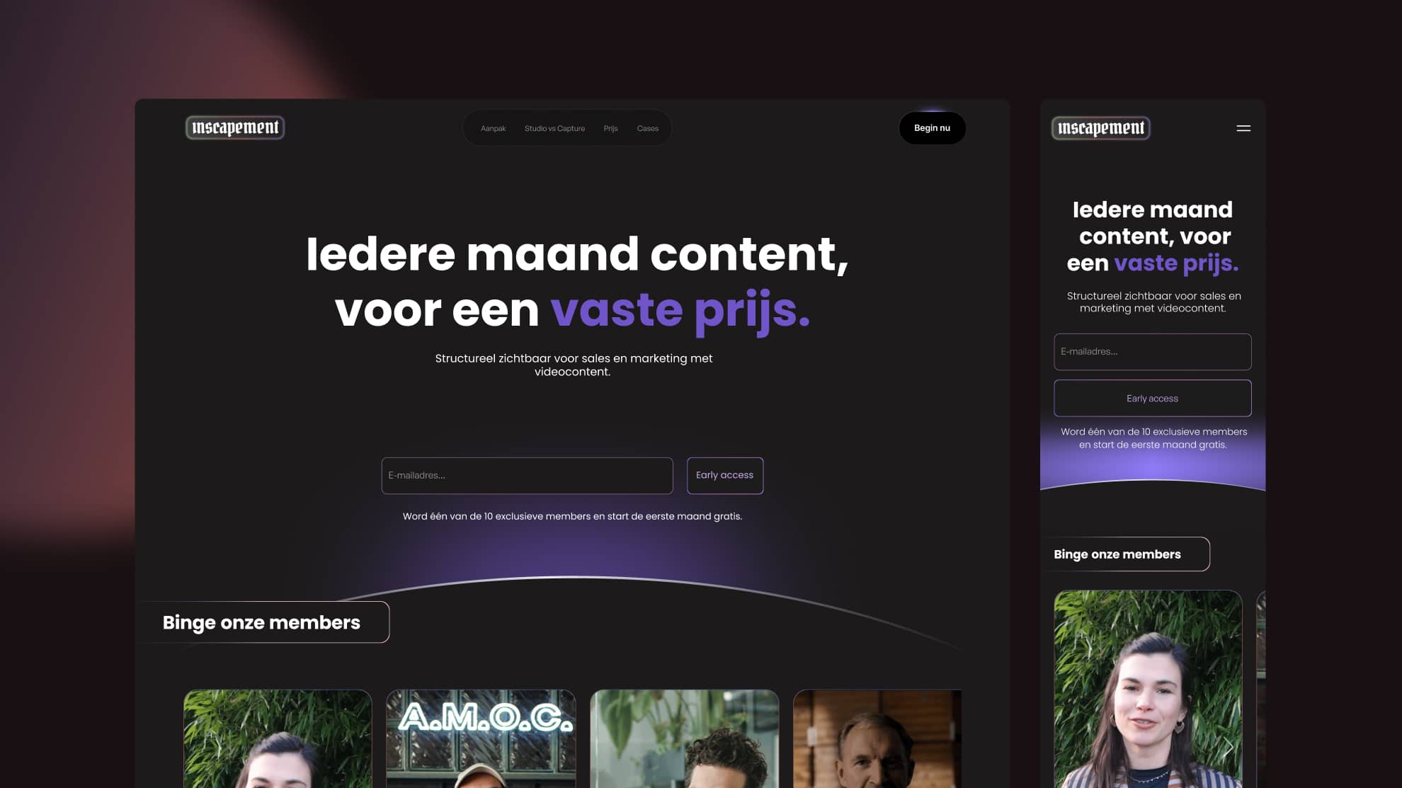 Het resultaat is een moderne website die niet alleen laat zien wat Inscapement doet, maar vooral overtuigt waarom het werkt. Door de juiste balans tussen beeld en tekst krijgt de bezoeker snel vertrouwen in het concept. De site ondersteunt de propositie van Inscapement als serieuze speler in contentproductie en helpt bij het aantrekken van nieuwe klanten die hun zichtbaarheid structureel willen vergroten.