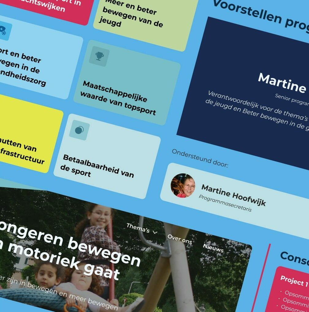 Ook is er plek voor actuele onderdelen zoals nieuws, publicaties en projecten. Het geheel is vormgegeven in een frisse, energieke stijl die beweging en vitaliteit uitstraalt, volledig passend bij de missie van MOOI in Beweging.