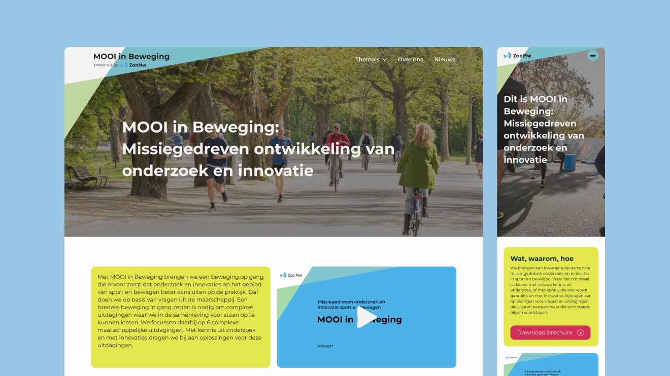 Daarnaast maakten we de site gebruiksvriendelijk door een flexibel CMS te implementeren. Het team kan hiermee eenvoudig zelf content toevoegen of aanpassen, van onderzoeksresultaten en beleidsdocumenten tot praktijkprojecten en verhalen uit het veld. Tegelijkertijd hebben we gezorgd voor een solide technische basis: de website laadt snel, werkt naadloos op alle apparaten en is geoptimaliseerd voor SEO. Zo bereikt MOOI in Beweging met hun boodschap een breed en divers publiek, en blijft de site toekomstbestendig.